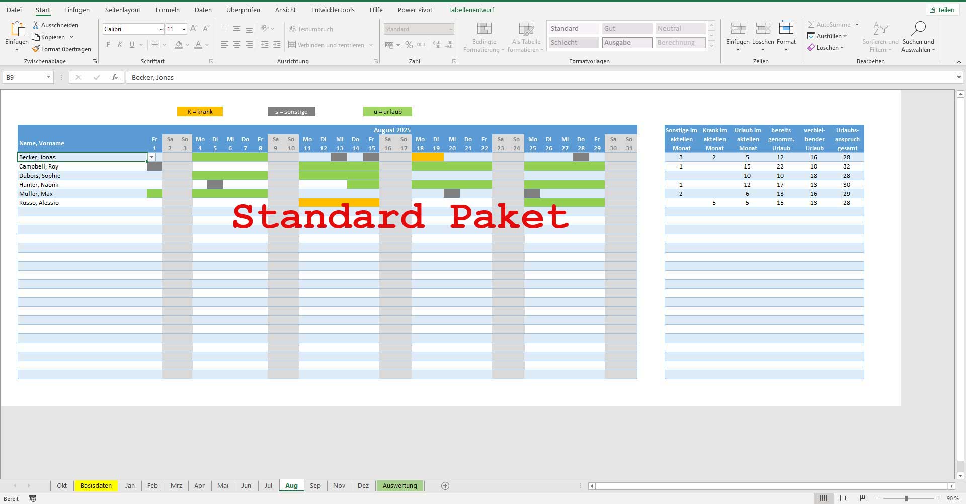 Durch einfache Kürzel (z. B. „u“ für Urlaub) färben sich die Zellen automatisch ein. Es entsteht sofort ein aussagekräftiges Gesamtbild der Team-Verfügbarkeit.
